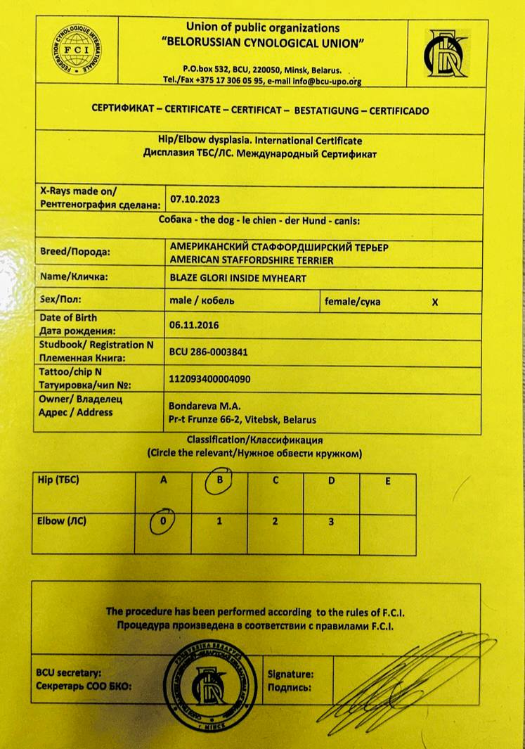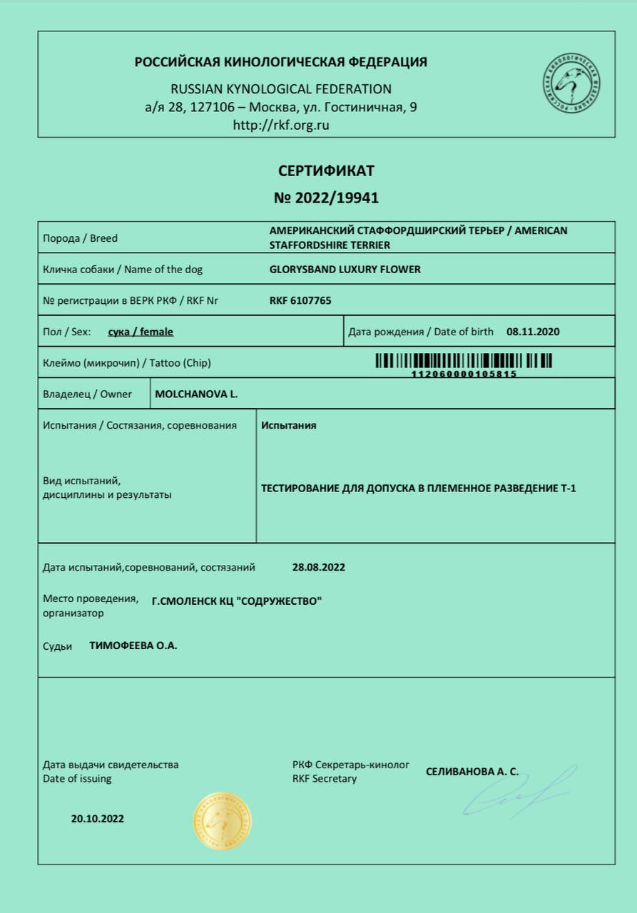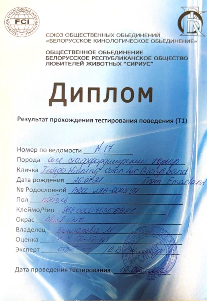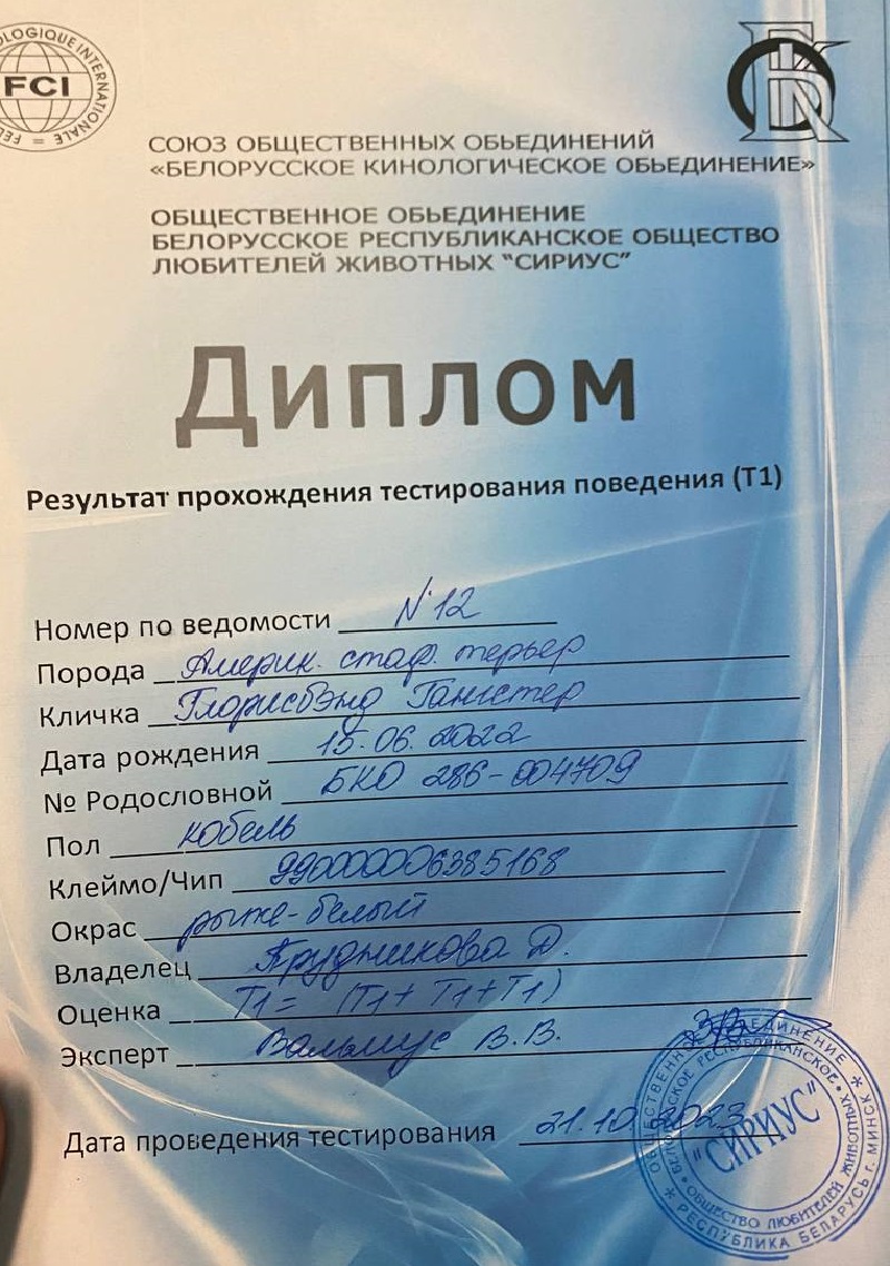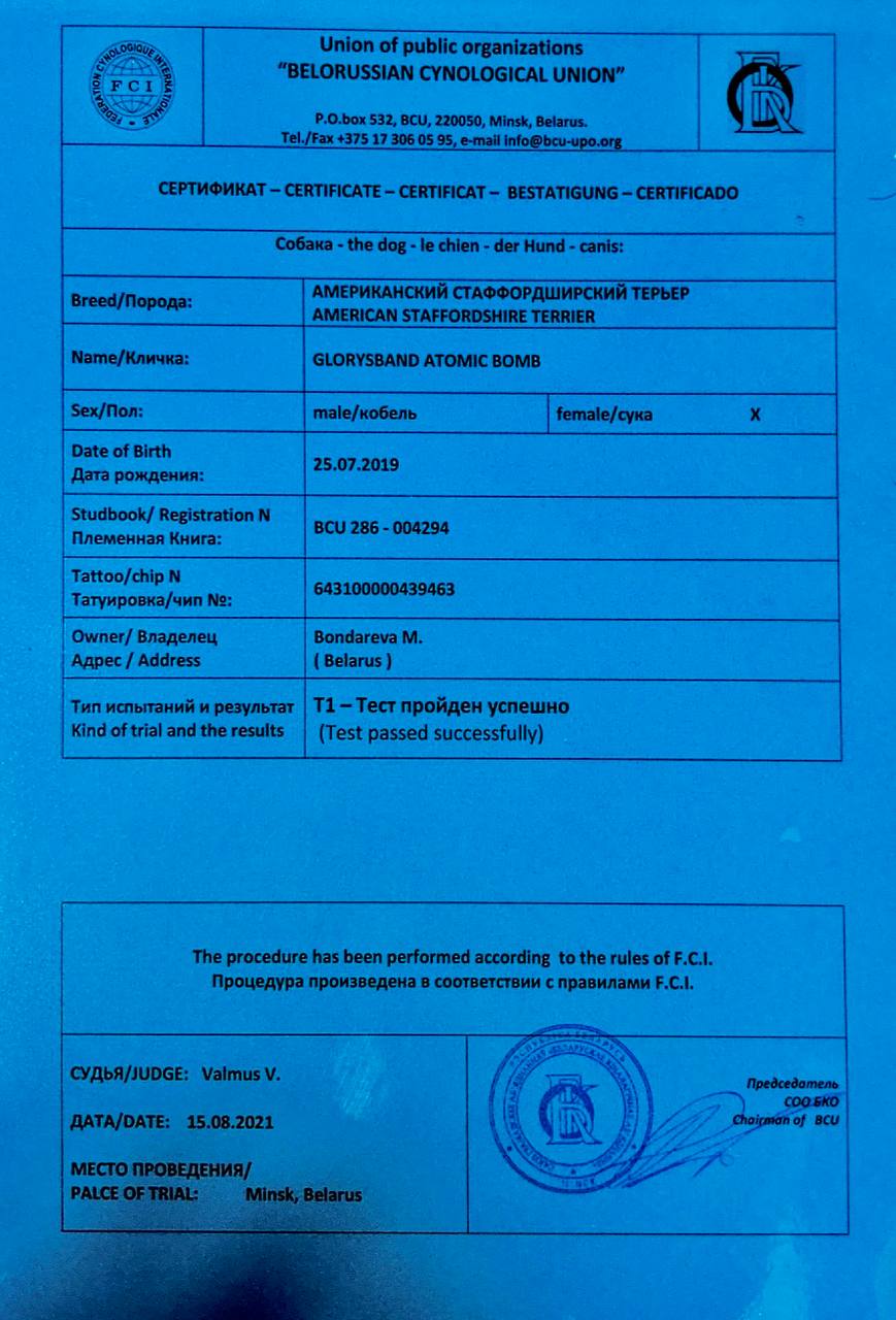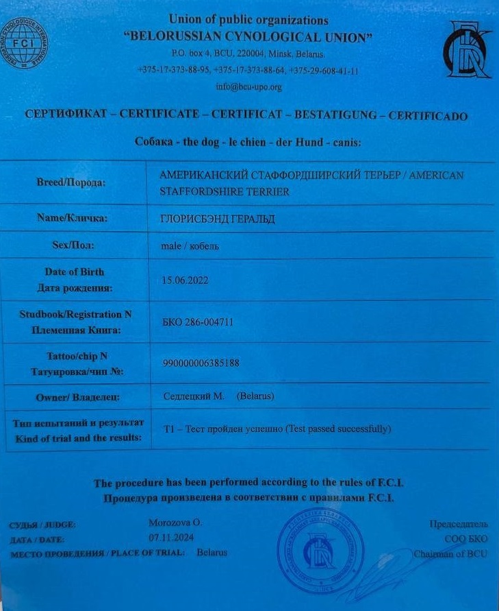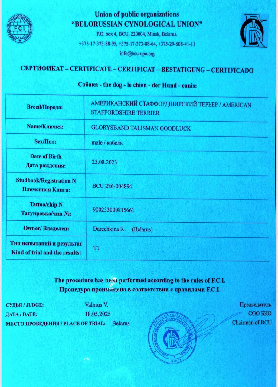 Амстаффы в питомнике Glorysband проходят программу отборного разведения. Мы уделяем внимание генетическим тестам, здоровью и психике, чтобы каждое новое поколение собак соответствовало высоким стандартам FCI. Мы понимаем, что выбор щенка — это доверие. Поэтому в питомнике Glorysband каждое разведение основано на проверках здоровья и психики производителей. Наши американские стаффордширские терьеры проходят обследования на дисплазию, атаксию и глазные болезни, а также тесты устойчивости характера.