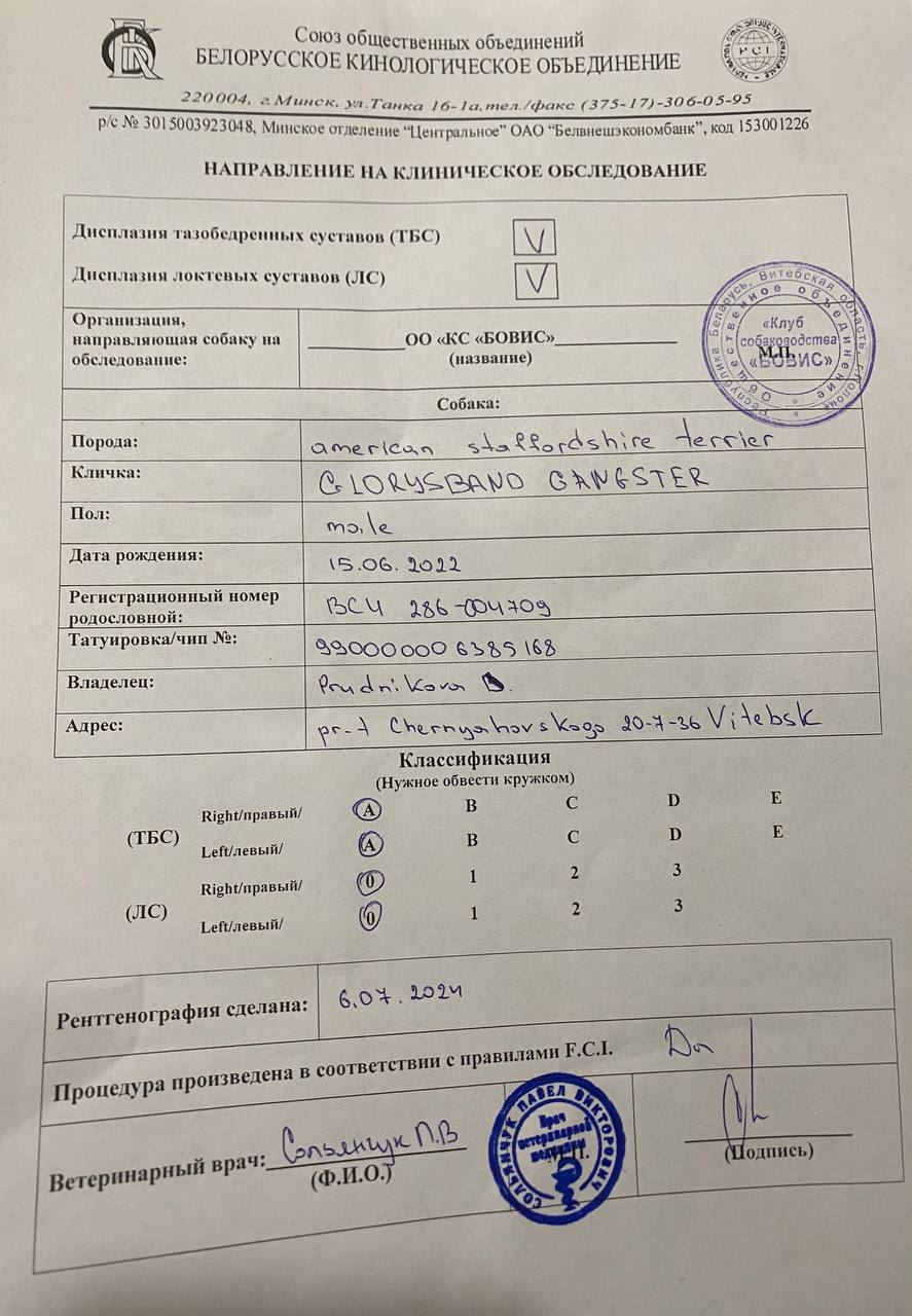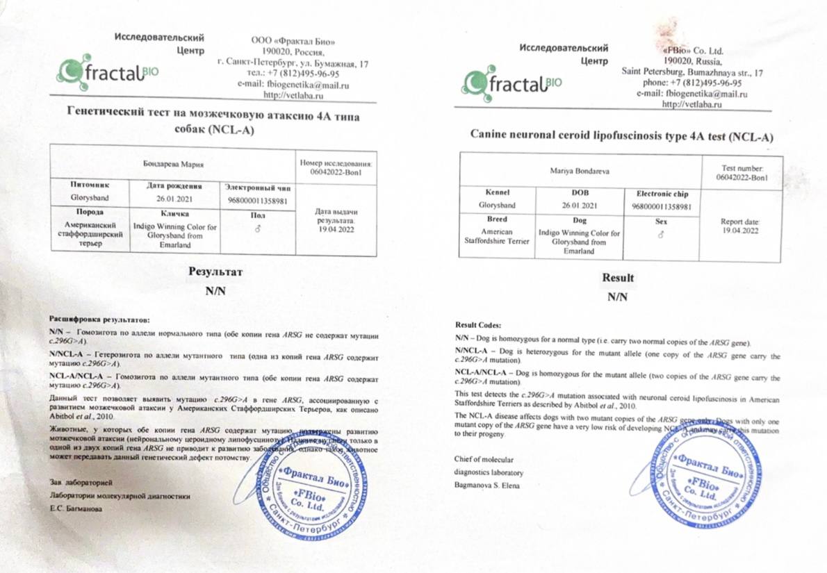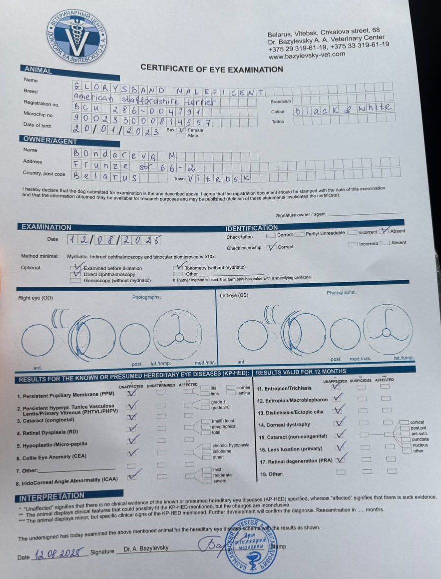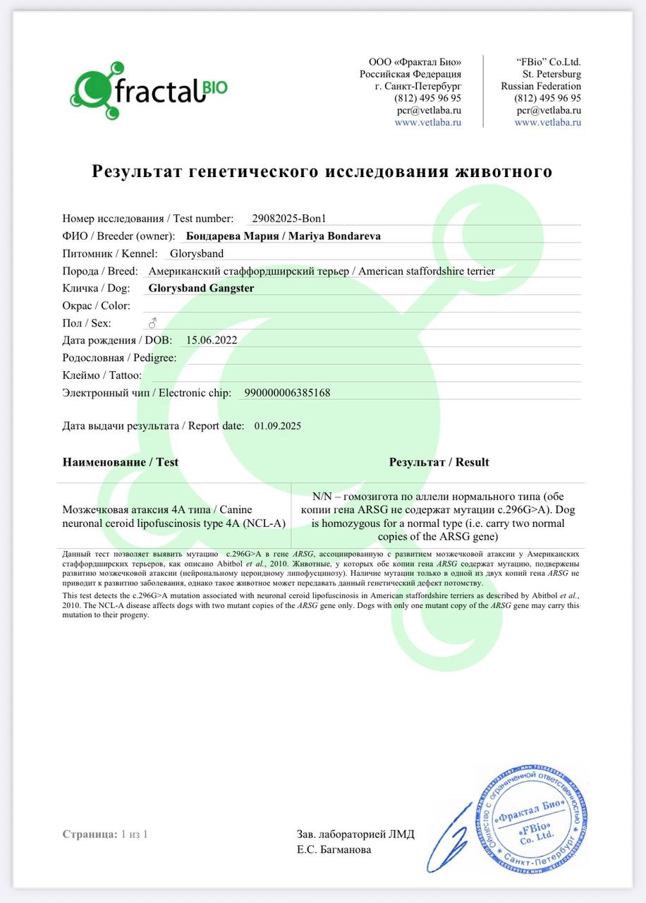 Здесь вы можете увидеть результаты медицинских тестов и родословные наших собак. Для нас важно, чтобы щенки Glorysband росли не только красивыми и сильными, но и здоровыми, уравновешенными и надёжными компаньонами.